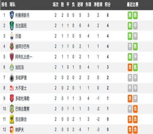 卡塔尔联的杜海勒本轮主场迎战沙特联的吉达国民,最终两队2-2握手言和。吉达国民1胜1平凭借净胜球优势排在积分榜第二,杜海勒1平1负凭借净胜球优势排在积分榜第九。