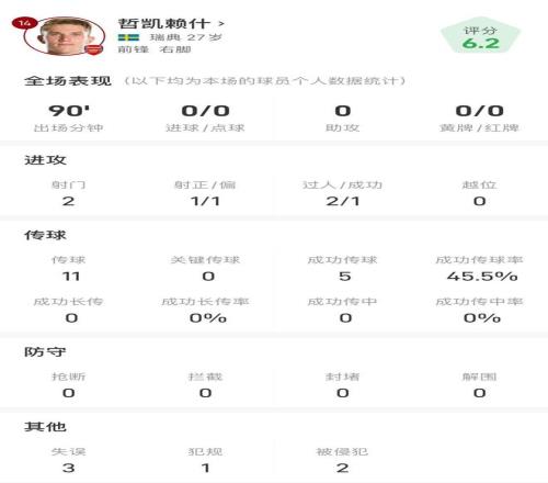 进攻:2次射门,1次射正,2次尝试过人,1次成功