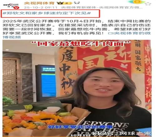 此外,在郑钦文刚回到武汉没多久,央视体育官网在报道这则消息时,已经提前说了郑钦文会退出武网一事,标题“郑钦文和家乡球迷约定下次见”就是最好的证明。