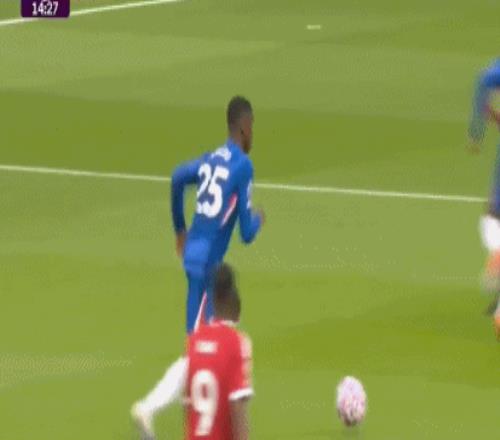 第39分钟,加纳乔左路强行加速突破,跟索博斯洛伊接触之后倒地,不过主裁判拒绝判罚点球。慢镜头看到索博斯洛伊有明显的推人动作,逃过了点球。