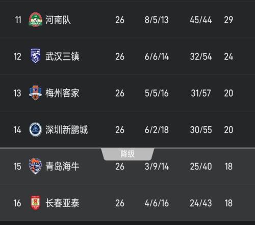 在本场比赛后,深陷保级泥潭的4支球队深圳新鹏城、青岛海牛、长春亚泰、梅州客家都进行了26轮比赛。