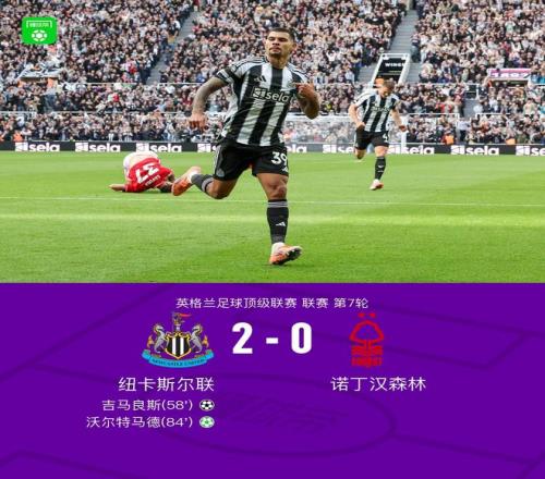 北京时间10月5日,英格兰足球超级联赛第7轮,纽卡斯尔联坐镇主场迎战诺丁汉森林。比赛中,丹-伯恩送出助攻,吉马良斯世界波先拔头筹。随后,吉马良斯制造点球,沃尔特马德点射稳稳命中,将比分扩大。凭借两粒进球,纽卡斯尔联以2-0战胜诺丁汉森林,全取三分。
