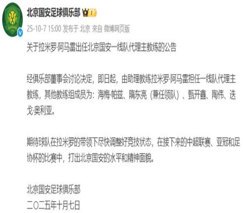 “第一个吃螃蟹的人”是用来比喻敢于冒险、率先尝试新事物的勇者。就在跟塞蒂恩分道扬镳之后,北京国安足球俱乐部也开始首尝螃蟹——官宣“沙滩足球皇帝”担任代理主帅。刚刚,北京国安官宣球队的临时主帅为塞蒂恩的助理教练拉米罗·阿马雷(下图),表示将由这位前沙滩足球教练带领球队继续踢中超、亚冠二级联赛和足协杯决赛。让一名沙滩足球教练担任球队临时主帅,北京国安此举可谓另辟蹊径,不走平常路。