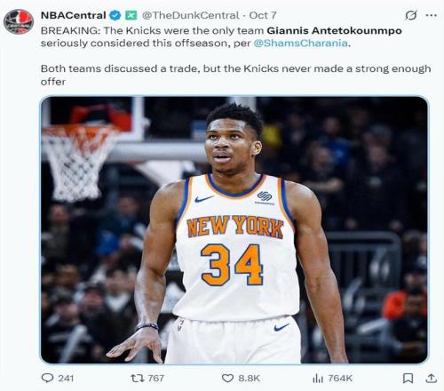 两天之前,ESPN记者Shams透露,今夏尼克斯与雄鹿商议过扬尼斯的交易,而扬尼斯本人最想去的球队就是尼克斯,只可惜尼克斯能付出的资产有限谈判破裂。