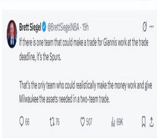 根据美记Brett Siegel说法,如果本赛季有球队可以负担扬尼斯的交易资产,那么就是马刺队,马刺是唯一可以满足雄鹿所需要求的球队。(因为此前雷霆记者已经明确表态,虽然手握多个首轮签但对扬尼斯毫无兴趣)