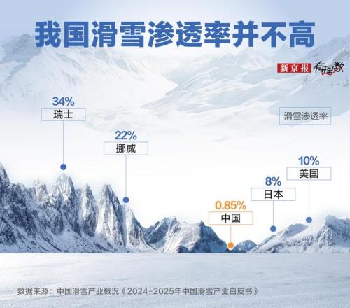 2024雪季数据显示,目前国内滑雪市场尚未形成稳定的滑雪消费群体,渗透率仅0.85%,而美国、日本滑雪人口渗透率都在10%左右,挪威瑞士更是超过20%。在这些国家,许多人从小就学习滑雪,并将其视为生活方式的一部分,这也意味着,滑雪人群的年龄层会更丰富。