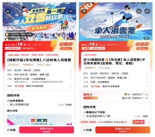 以滑雪热门地河北张家口为例,近几年当地滑雪场数量大幅扩容,竞争愈发激烈,多家雪场纷纷下调价格,百元内就能拿下门票,和此前两三百元的定价形成鲜明对比。一些其他雪场甚至在团购平台上推出19.9 元、29.9元的超低价雪票,堪称“白菜价”体验。