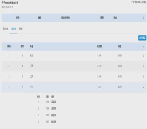 今晚(11月20日),十五运会进行了田径项目男子4×100米接力决赛。由苏炳添、刘洪熙、施君豪、陈冠锋组成的广东队...