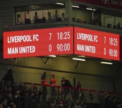 这是2022/23赛季英超第26轮的比赛结果,当时利物浦主场7-0战胜曼联,是曼联队史在英超遭遇的最惨痛失利之一。